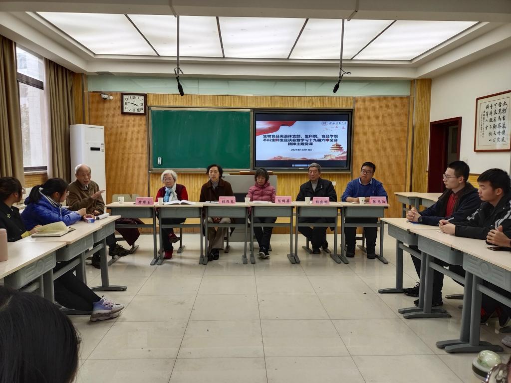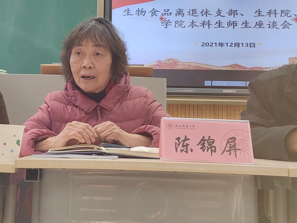为深入学习党的十九届六中全会精神,发挥离退休老党员的余热,引领学生增强爱党爱国情怀,2021年12月13日下午生物食品离退休支部、生科院、食品学院于雁塔校区教学八楼8305教室联合举办学习十九届六中全会精神退休老党员与本科生座谈会。退休教师代表陈锦屏、黄维玉、薛知文、张迎春、杨建雄等5位老师、2021级本科生辅导员陈思雨老师和两个学院部分学生代表参与此次活动。