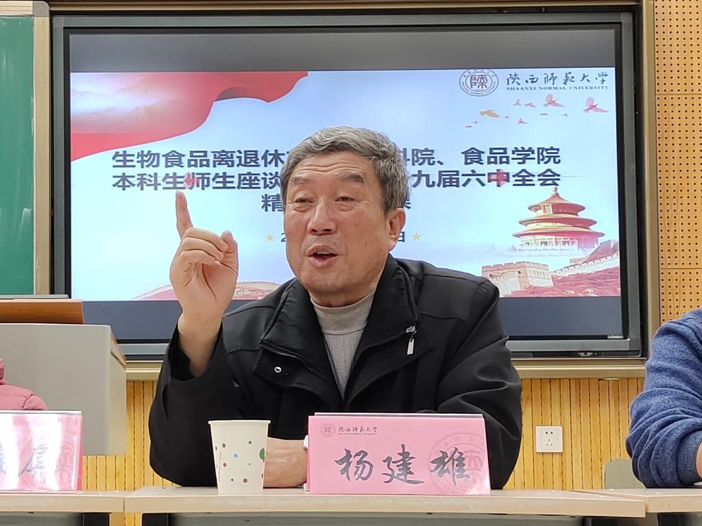 会议由生物食品离退休支部书记杨建雄老师主持。首先,杨老师介绍了这次活动的背景和目的,介绍了与会的各位退休党员代表。杨老师讲到,十九届六中全会的召开为全党和全国指明了方向,也为在座的青年学生指明了方向。不论是学生还是离退休老党员,都要以此为契机,深入学习十九届六中全会的精神,希望通过此次互动,青年学生能和老党员们多多交流,在生活中找到人生的方向,在社会上找到合适的位置,极尽个人之所能,为党的事业和国家的发展做贡献。